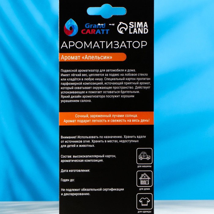 Подвесной ароматизатор для автомобиля и дома. Имеет лёгкий вес и цепляется за подвес на лобовое стекло или кладётся в любую нишу. Специальный картон пропитан парфюмерной композицией и источает приятный аромат, который охватит окружающее пространство и будет успокаивать и одновременно помогать оставаться бдительным. А яркий дизайн ароматизатора послужит хорошим украшением для салона.
