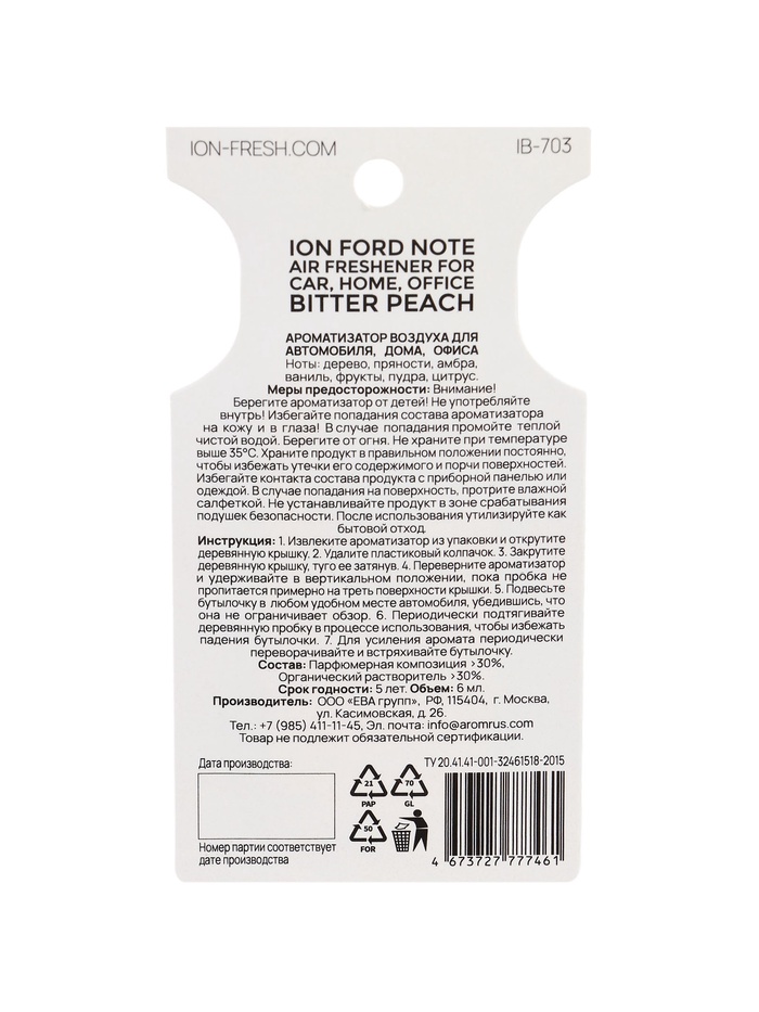 Подвесной ароматизатор с сочным и нежным ароматом спелого персика — это лёгкий способ добавить в повседневную поездку нотки летнего настроения. Элегантный стеклянный флакон объёмом 6 мл с деревянной крышкой не только украшает интерьер автомобиля, но и обеспечивает равномерное распространение аромата. Свежий, фруктовый и жизнерадостный — этот аромат создаёт атмосферу комфорта и безмятежности.