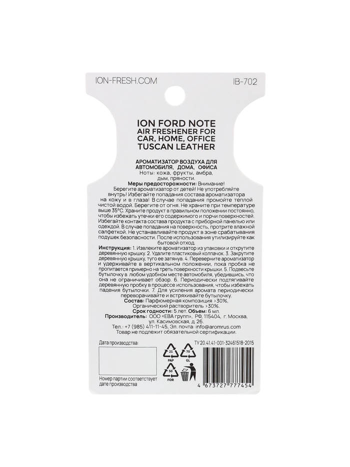 Роскошный подвесной ароматизатор с выразительным кожаным ароматом — идеальное дополнение для стильного салона автомобиля. Композиция вдохновлена элитной нишевой парфюмерией и сочетает насыщенные кожаные ноты с оттенками специй и древесины. Благодаря минималистичному дизайну и высокому качеству исполнения, данный ароматизатор не только эффективно освежает воздух, но и подчёркивает вкус и статус владельца.