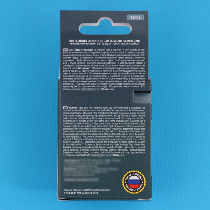 «Новая машина» - это освежающий аромат кожаного салона нового люксового автомобиля. Благодаря массивной деревянной крышке из натурального бука аромат плавнее и дольше передается в салоне, эффективно устраняя неприятные запахи. Для усиления аромата периодически переворачивайте флакон в закрытом состоянии и слегка пропитывайте крышку ароматической жидкостью. Для создания данной ароматической композиции используются только высококачественные парфюмерные отдушки из Франции.