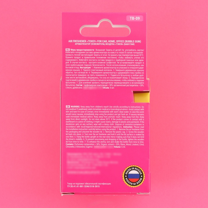 «Бабл Гам» - это аромат всеми любимой с детства вкусной и сладкой жвачки, который никого не оставит равнодушным. Благодаря массивной деревянной крышке из натурального бука аромат плавнее и дольше передается в салоне, эффективно устраняя неприятные запахи. Для усиления аромата периодически переворачивайте флакон в закрытом состоянии и слегка пропитывайте крышку ароматической жидкостью.