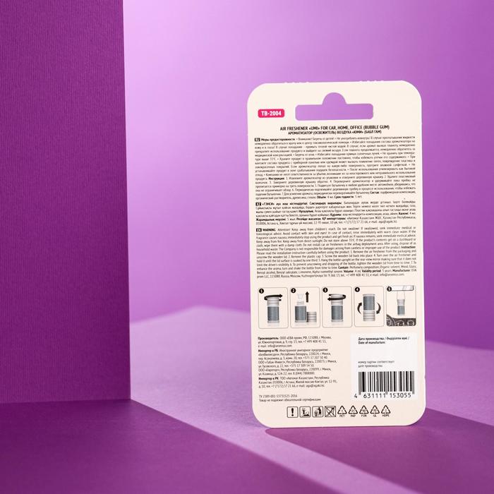 Подвесной ароматизатор UMI в стеклянной бутылочке со стильным вощенным шнурком удобно использовать в автомобиле. Благодаря массивной деревянной крышке из натурального бука аромат плавнее и дольше передается в салоне, эффективно устраняя неприятные запахи. Для усиления аромата периодически переворачивайте флакон в закрытом состоянии и слегка пропитывайте крышку ароматической жидкостью. Аромат Бабл Гам – сладкий, вкусный аромат любимой жевательной резинки. Аромат повышает настроение, возвращает нас в счастливое и беззаботное детство.