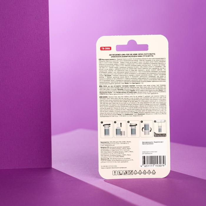 Подвесной ароматизатор UMI в стеклянной бутылочке со стильным вощенным шнурком удобно использовать в автомобиле. Благодаря массивной деревянной крышке из натурального бука аромат плавнее и дольше передается в салоне, эффективно устраняя неприятные запахи. Для усиления аромата периодически переворачивайте флакон в закрытом состоянии и слегка пропитывайте крышку ароматической жидкостью. Тутти-фрутти сочетает в себе гамму ароматов разноцветных кондитерских изделий из засахаренных экзотических фруктов.