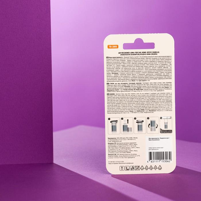 Подвесной ароматизатор UMI в стеклянной бутылочке со стильным вощенным шнурком удобно использовать в автомобиле. Благодаря массивной деревянной крышке из натурального бука аромат плавнее и дольше передается в салоне, эффективно устраняя неприятные запахи. Для усиления аромата периодически переворачивайте флакон в закрытом состоянии и слегка пропитывайте крышку ароматической жидкостью. Соблазнительное сочетание ароматов ванили, кокосового молока и сахарного тростника.