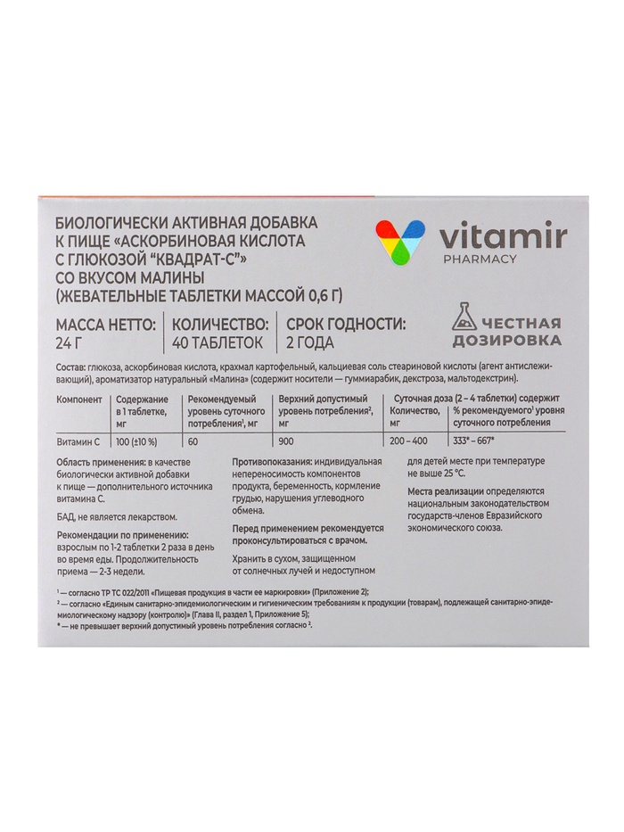 Аскорбиновая кислота с глюкозой, малина «Витамир» TETRALAB — эффективная поддержка иммунитета и энергии. Подходит для регулярного применения, способствует укреплению защитных сил организма, повышению жизненного тонуса и сохранению здоровья в течение всего года.