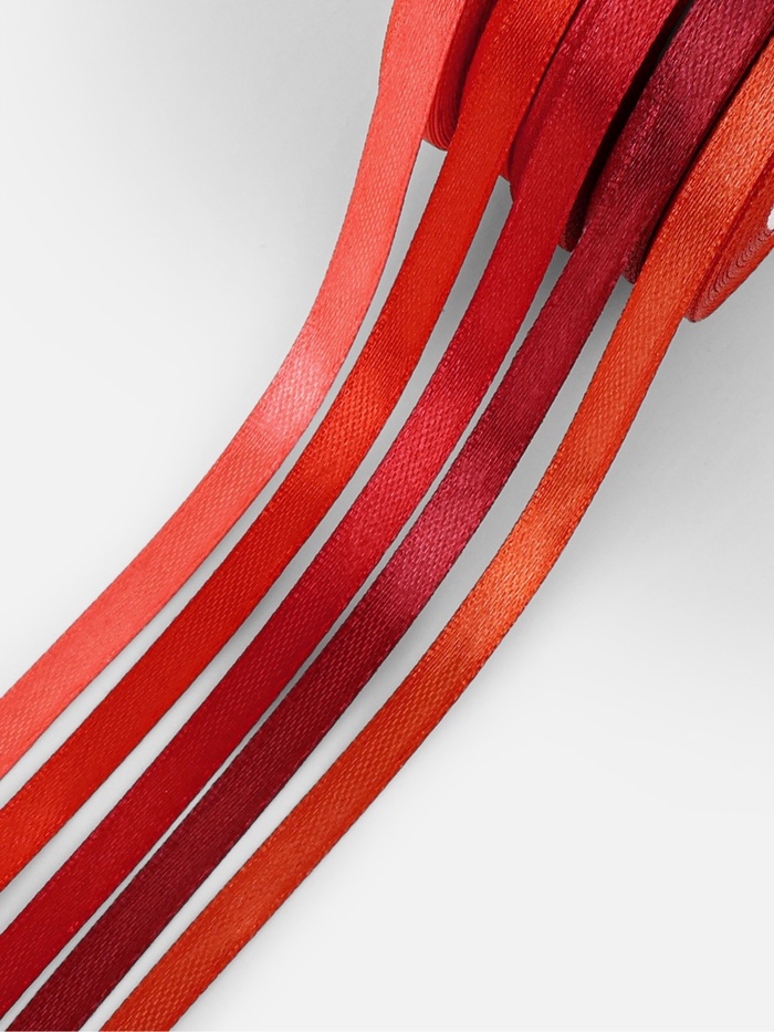 Этот набор тонких атласных лент — отличный выбор для создания украшений, подарочной упаковки и декоративных элементов. В комплект входит пять лент шириной 6 мм и длиной около 23 метров каждая, выполненных из качественного полиэстера с гладкой атласной поверхностью. Их насыщенный красный и бордовый оттенки подходят для праздничных и романтических проектов.