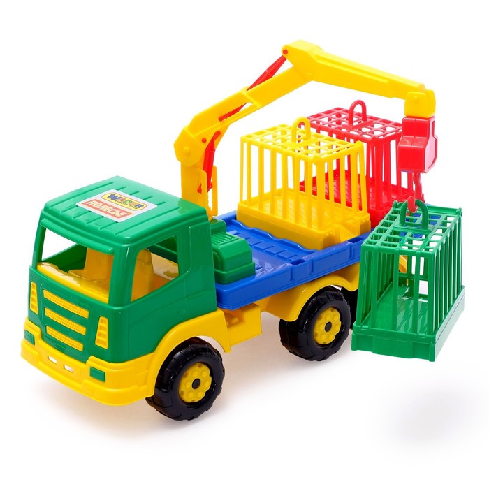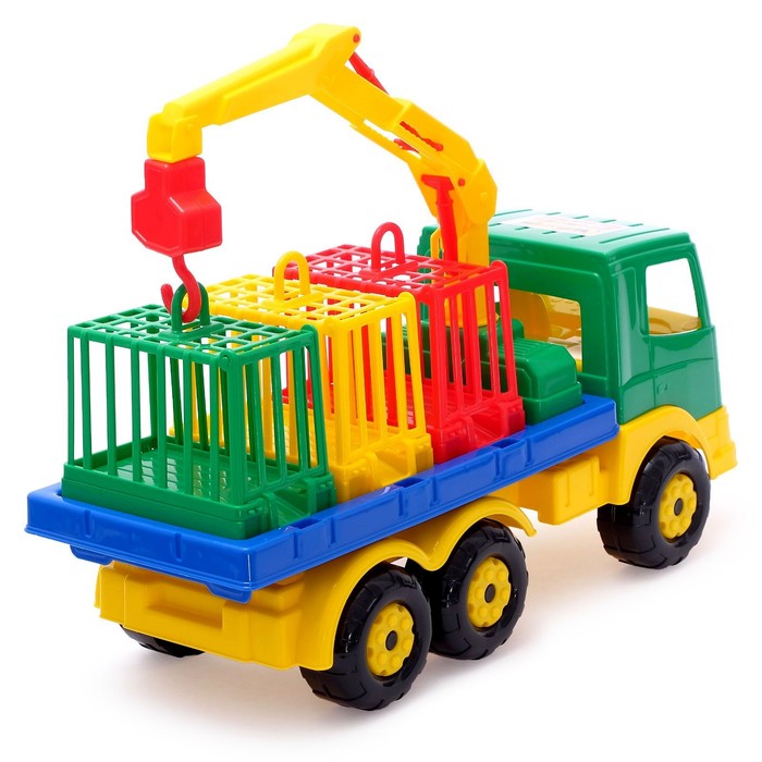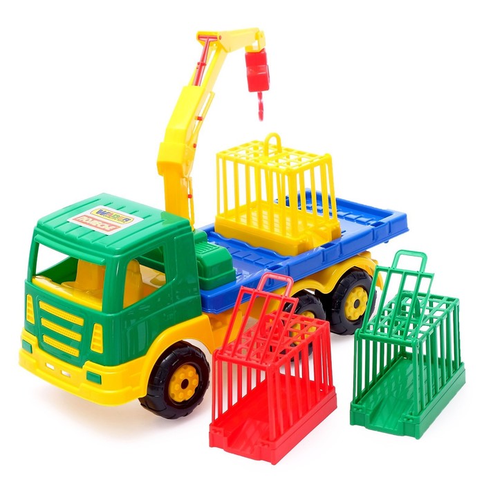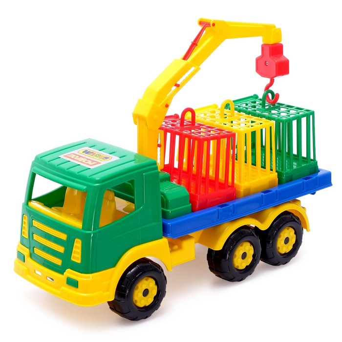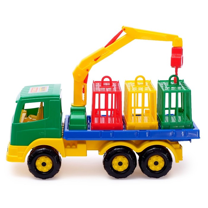 Контейнеровоз ТМ «Полесье» — первоклассный помощник в транспортировке грузов. Он оборудован подвижной стрелой с крюком, которой можно перемещать клетки прямо на широкую платформу. Большие колёса техники выполнены из пластика. Они справятся даже со сложными преградами!