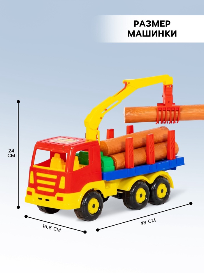 Лесовоз — машинка, о которой мечтает каждый мальчишка! Она оснащена подвижным манипулятором с цепким захватом, который легко загружает в кузов массивные брёвна. Его большим пластиковым колёсам не страшны никакие преграды, будь то грязь или лужа. Придумывайте вместе с ребёнком разные сюжетные игры и развивайте воображение.