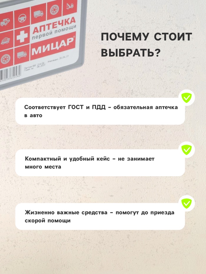Автомобильная аптечка первой помощи №1 «Мицар» в дорожном футляре «Мини» — это надежное и необходимое средство обеспечения безопасности в пути. Она поможет своевременно оказать первую помощь в экстренных ситуациях, обеспечивая защиту и спокойствие водителя и пассажиров.