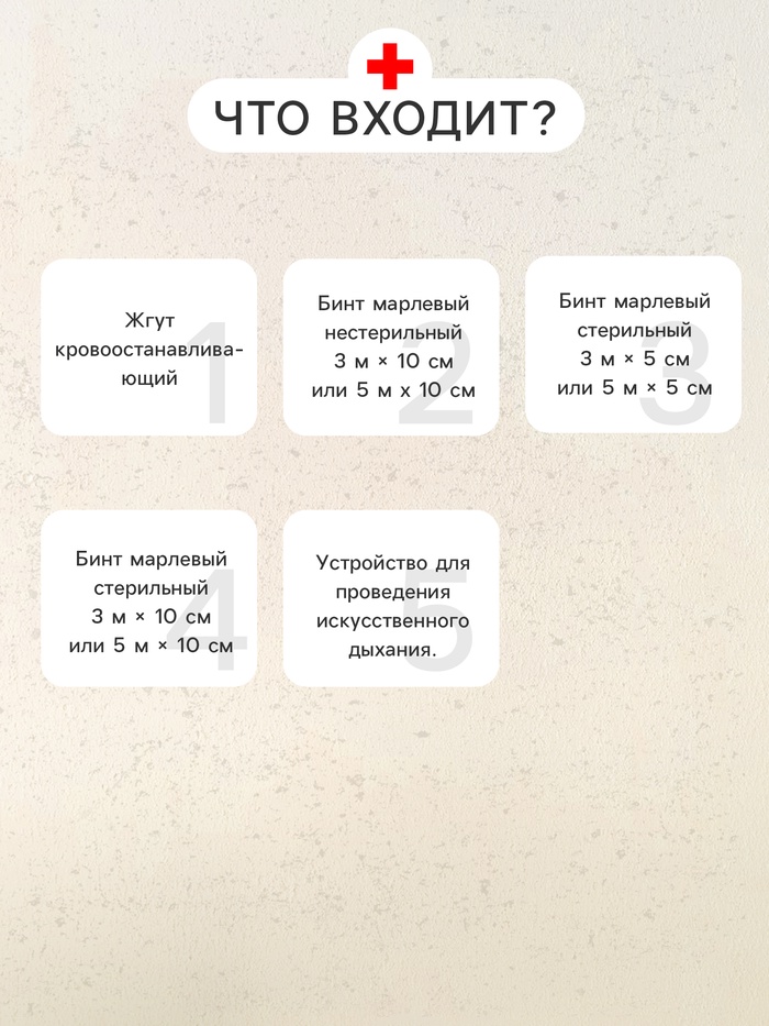 - Комплектация: содержит необходимые медицинские средства для оказания первой помощи;