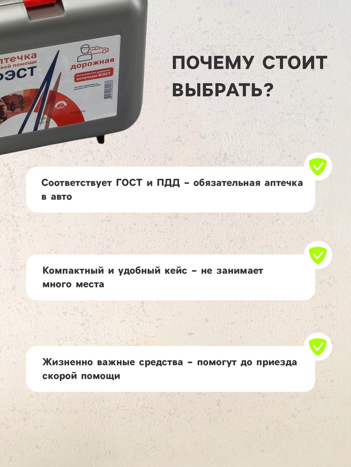 Автомобильная аптечка первой помощи «ФЭСТ» №1 в футляре №5 — это надёжное и необходимое средство обеспечения безопасности в пути. Она поможет своевременно оказать первую помощь в экстренных ситуациях, обеспечивая защиту и спокойствие водителя и пассажиров.