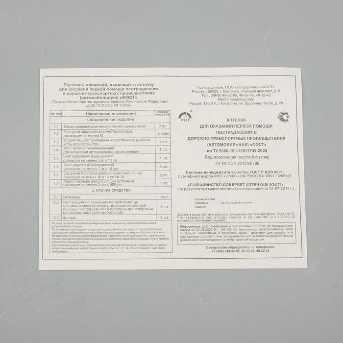 Автомобильная аптечка первой помощи ФЭСТ (состав 2024 года, приказ №1080н, красная) - это обязательный элемент оснащения транспортного средства, который соответствует актуальным требованиям законодательства. Компактная и удобная сумка с медицинским набором помогает оказать первую помощь при несчастных случаях на дороге до приезда специалистов.
