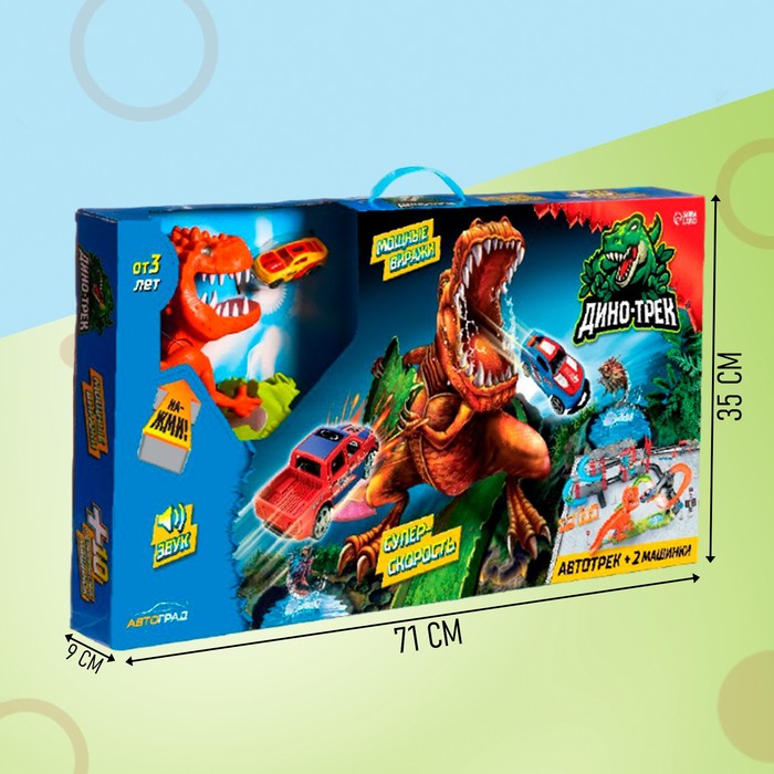 Соберите трассу и запускайте автомобили. Скатываясь по дороге, они будут попадать то в пасть к динозавру, то проезжать под его хвостом — мальчишка будет в восторге. Регулируя высоту дороги или отправляя машинки в полёт катапультой, можно просчитать, куда они приземлятся.