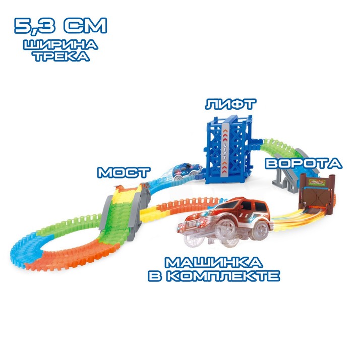 «Магический трек» — это набор для зрелищных заездов. Ребёнка удивит то, что дорогу можно собрать не просто так, чтобы она поворачивала и петляла в разные стороны, но также сделать выпуклой или вогнутой или вообще закольцевать, заставив машинку ехать внутри неё.