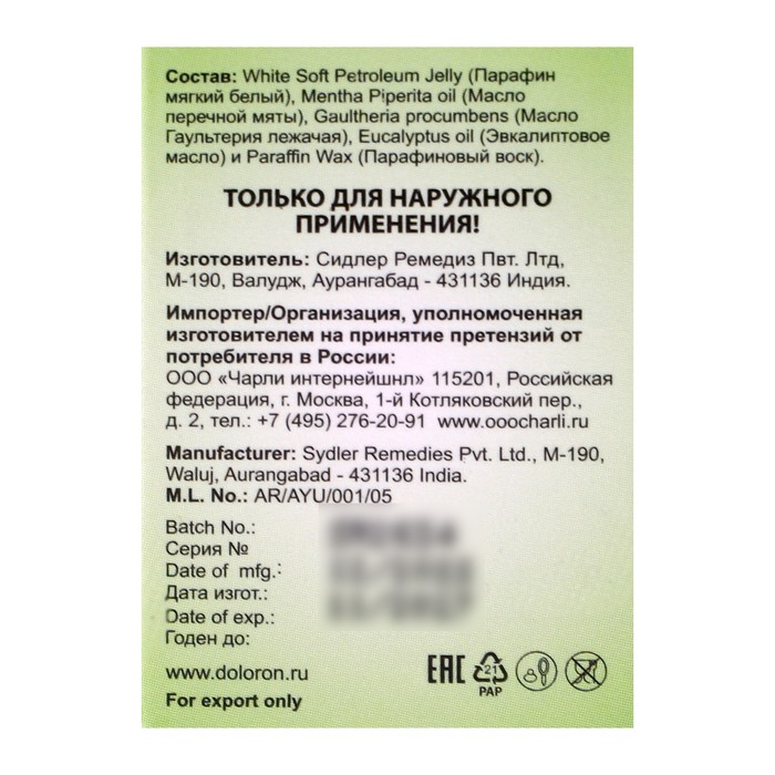Состав: Мята полевая, эвкалипт, масло гаултерия, белая мягкая парафиновая основа