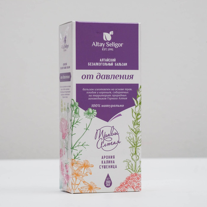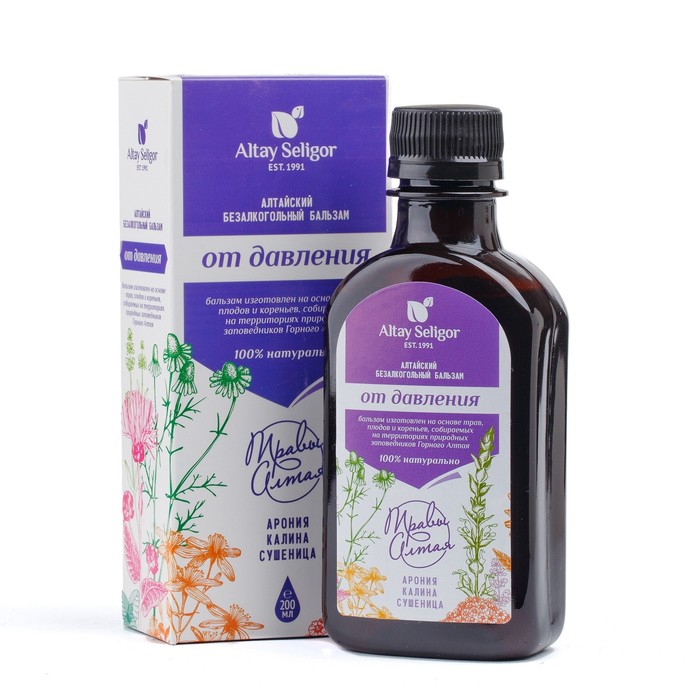 Алтайский бальзам на травах рекомендуется для нормализации давления. Средство производит мягкий гипотензивный эффект. Арония, калина, сушеница — активные действующие травы в бальзаме. Не содержит алкоголя, можно применять каждый день.