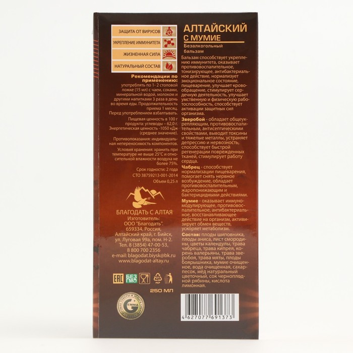 Безалкогольный бальзам «Алтайский» создан на травах Горного Алтая и содержит мумиё. Он активизирует обмен веществ, помогает снять головную боль и уменьшить стресс, нервное возбуждение, депрессию, бессонницу.