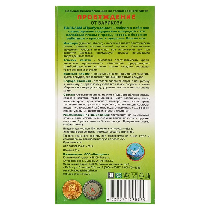 Состав: плоды шиповника, маклюра (адамово яблоко), плоды конского каштана, трава донника, цветки календулы, хвоща полевого трава, цветки красного клевера, лист мяты, трава тысячелистника, трава мокрицы (звездчатки), плоды софоры, плоды черноплодной рябины, вода очищенная, сахар-песок, мёд натуральный цветочный, кислота лимонная.