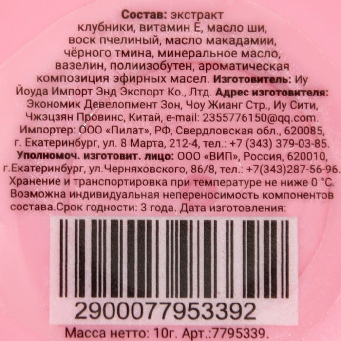 Состав: экстракт клубники, витамин Е, масло ши, воск пчелиный, масло макадамии, масло черного тмина, минеральное масло, вазелин, полиизобутен, ароматическая композиция эфирных масел.