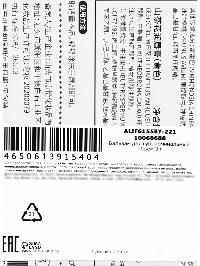 Бальзам предназначен для ухода за губами и для защиты от вредных факторов окружающей среды. Он содержит питательные компоненты, обладающие ухаживающими свойствами, предупреждающими обветривание губ и появление трещин. Хорошо смягчает губы и придаёт им естественный блеск.