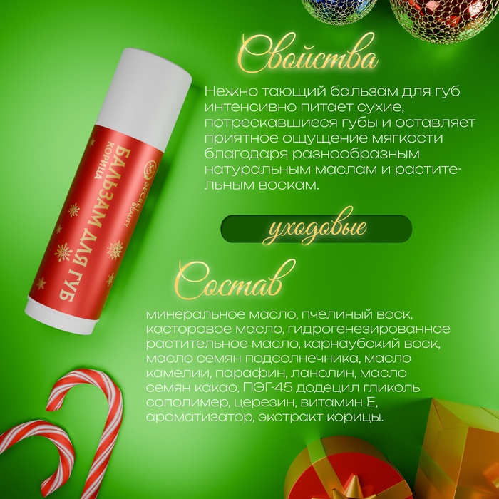 Создайте праздничное настроение и заботьтесь о своих губах с нашим новогодним бальзамом с ароматом корицы. Идеально подходящий для холодного времени года, этот бальзам станет вашим верным спутником в заботе о губах и приятным элементом новогоднего декора.