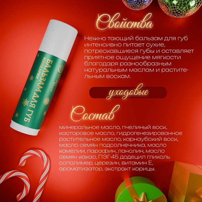 Погружайтесь в атмосферу новогоднего волшебства и заботьтесь о своих губах с нашим новогодним бальзамом с ароматом мандарина. Этот бальзам не только увлажняет и защищает губы, но и приносит радость и свежесть с каждым применением.