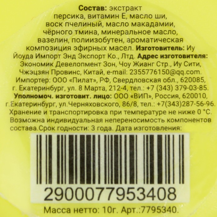 Состав: экстракт персика, витамин Е, масло ши, воск пчелиный, масло макадамии, масло черного тмина, минеральное масло, вазелин, полиизобутен, ароматическая композиция эфирных масел.