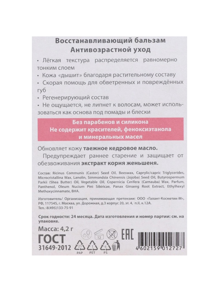 Бальзам для губ БиСи "восстанавливающий" содержит настоящее кедровое масло и экстракт женьшеня, помогающие глубоко ухаживаь за губами. Улучшает регенерацию кожи губ, благодаря чему поврежденная кожа лучше восстанавливается. Препятствует преждевременному старению, разглаживает микрорельеф кожи губ, противостоит потере влаги, помогает бороться с простудой на губах. После регулярного применения кожа губ становится мягкой, привлекательнои и ухоженной.