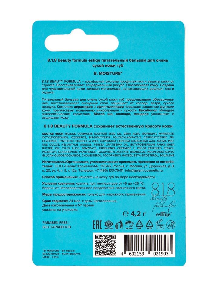 Питательный бальзам создан специально для интенсивного ухода за очень сухой и повреждённой кожей губ. Его формула с увлажняющими и восстанавливающими компонентами глубоко питает, смягчает и помогает избавиться от чувства стянутости. Средство образует защитный барьер, удерживающий влагу, и надолго сохраняет губы увлажнёнными даже в неблагоприятных условиях — при морозе, ветре или сухом воздухе.