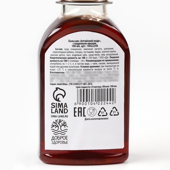 Состав: вода очищенная, лимонная кислота, шиповник, черноплодная рябина, солодка, пустырник, бадан, золотой корень, красная щётка, чага, кедровый орех, сахар-песок, мёд натуральный.