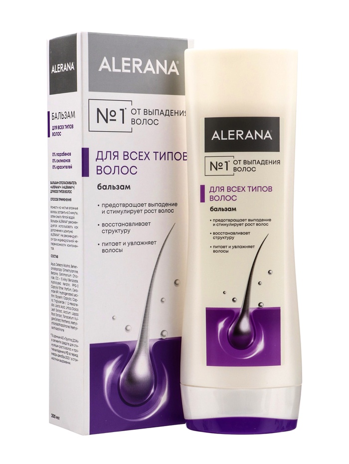 Результат: здоровые и блестящие волосы без утяжеления, ломкости и выпадения. Специализированная серия безсульфатного бальзама для волос ALERANA базируется на достижениях современной косметологии и фармакологии.