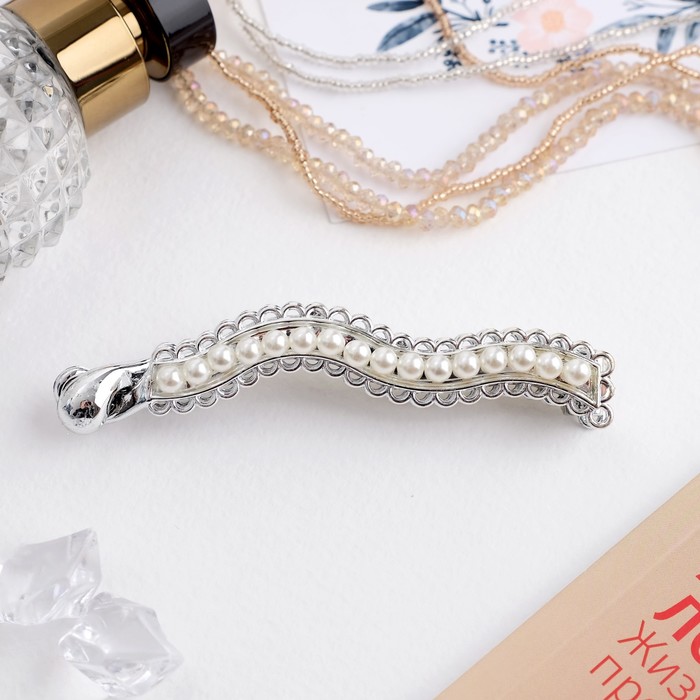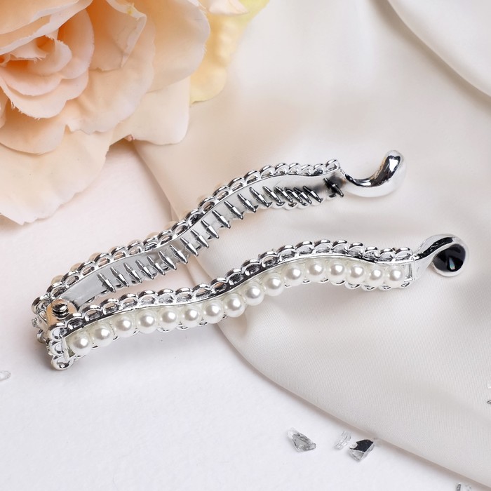 Создайте изысканный образ с акцентом на деталях! Заколка-банан «Тайна морей» – изящный аксессуар для волос, который добавит вашему образу нотку элегантности. Гладкая серебристая поверхность дополнена ажурными элементами и бусинами, создавая иллюзию морских волн и придавая прическе воздушность и изысканность.
