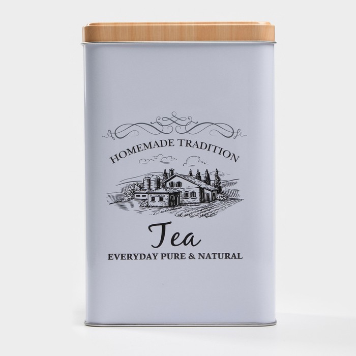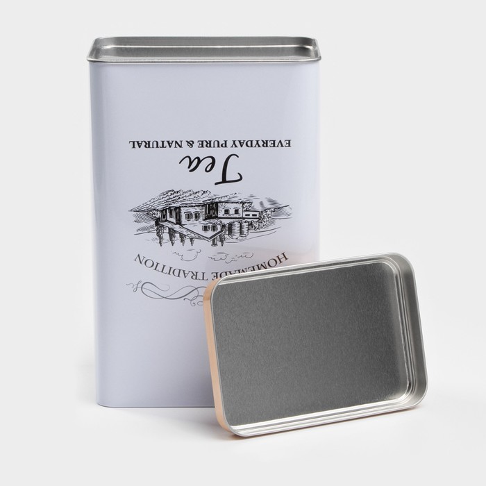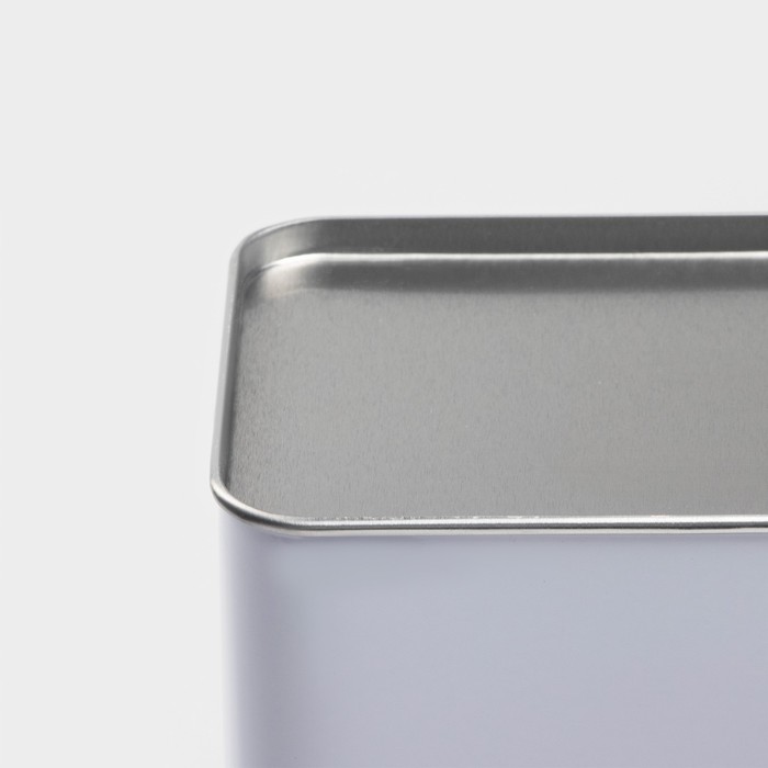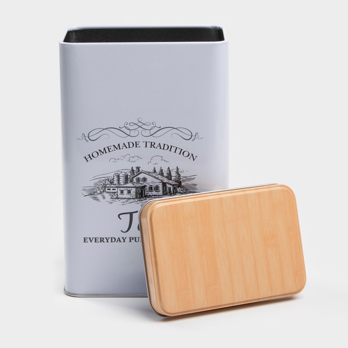 Банка для сыпучих продуктов изготовлена из жести. Крышка плотно закрывается и защищает еду от излишней влаги и проникновения посторонних запахов.