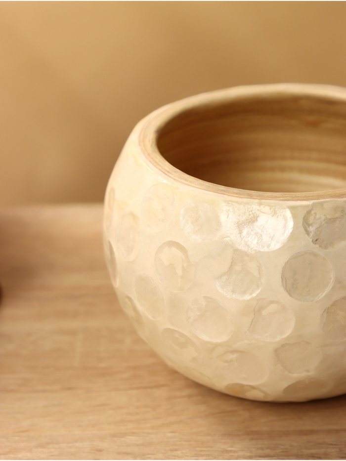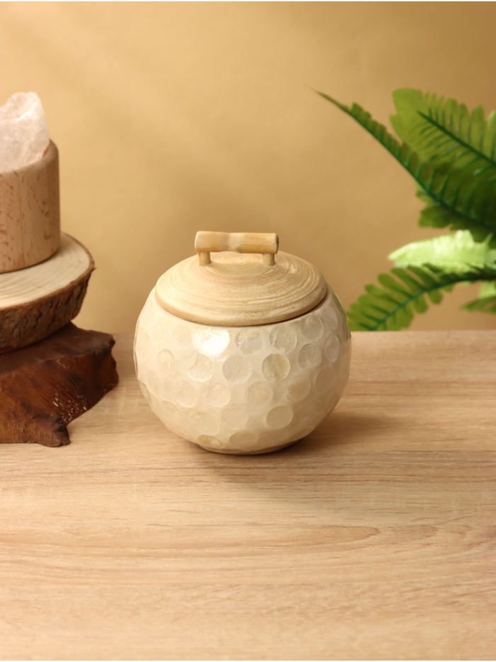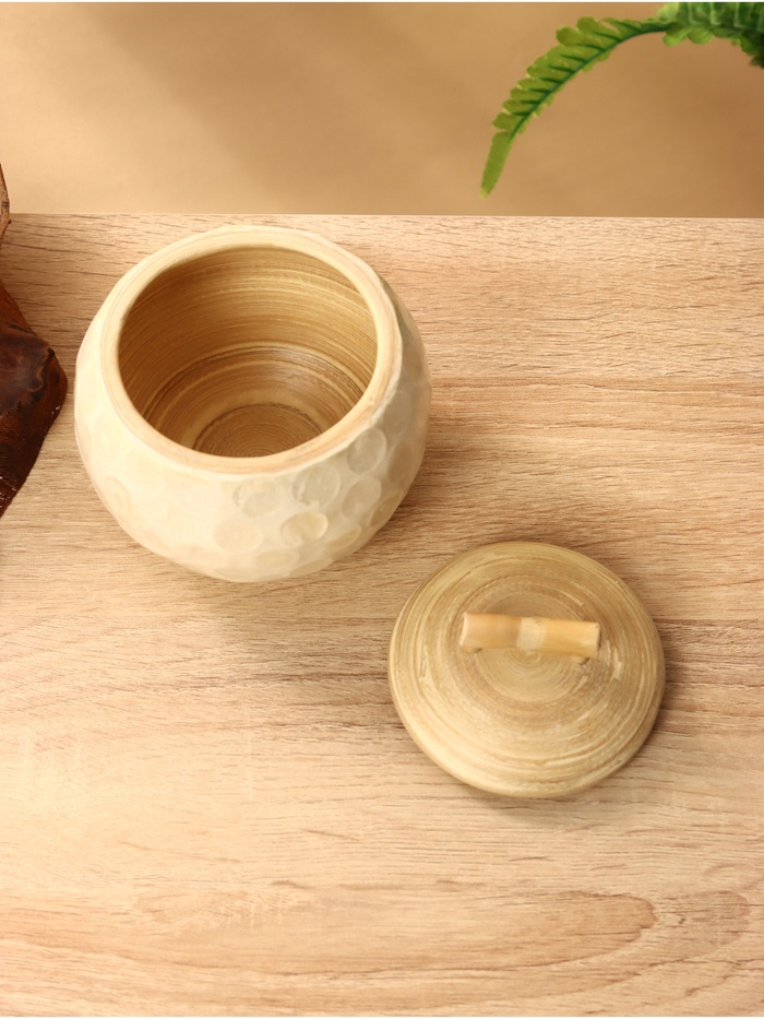 Бамбуковая банка для сыпучих продуктов с крышкой из натурального материала подойдёт для хранения кофе, чая или круп. Гладкая текстура и круглый корпус делают её удобной в использовании, а бежевый цвет и рисунок добавляют эстетики кухонному пространству.