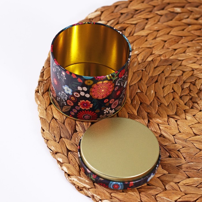 Банка для сыпучих продуктов изготовлена из жести. Крышка плотно закрывается и защищает еду от излишней влаги и проникновения посторонних запахов.
