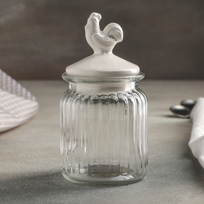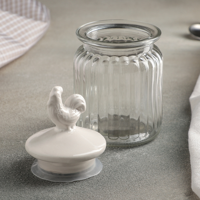 Банка стеклянная для сыпучих продуктов с керамической крышкой «Петух», 300 мл, 7,5×14,5 см, цвет крышки белый