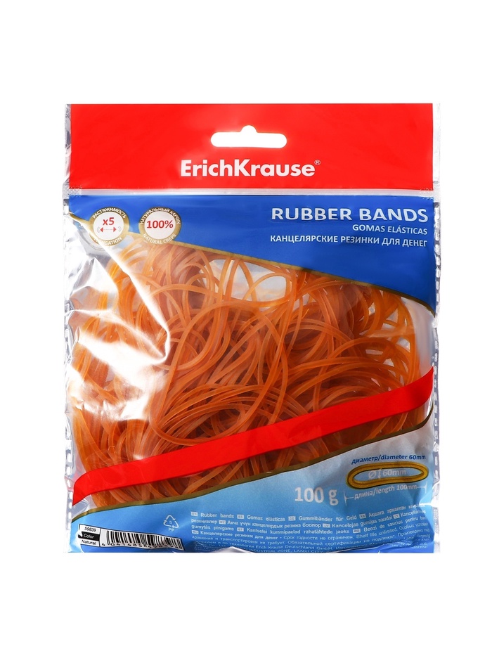 Банковская резинка, 100 г, ErichKrause, диаметр 60 мм, длина 100 мм, 100% каучук, ZIP-пакет с европодвесом, натуральный цвет