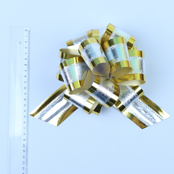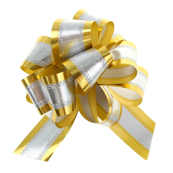 Для того чтобы собрать бант, надо потянуть за две ленточки, находящиеся между широкими лентами, удерживая широкие ленты в месте спайки. Бант собирается за несколько секунд.