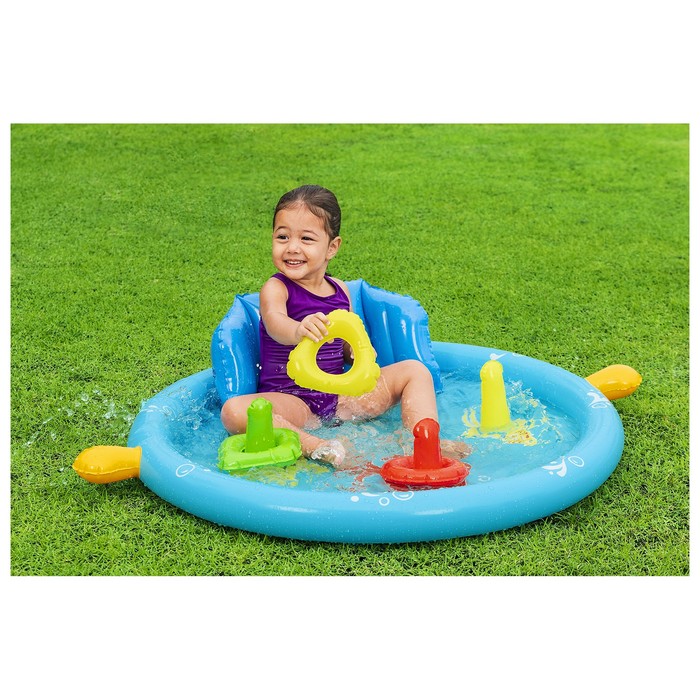 Детский бассейн можно разместить в доме и на улице. Модель оснащена поддерживающей спинкой и съёмным навесом от солнца. Цветные конусы и кольца служат для развития мелкой моторики рук ребёнка.