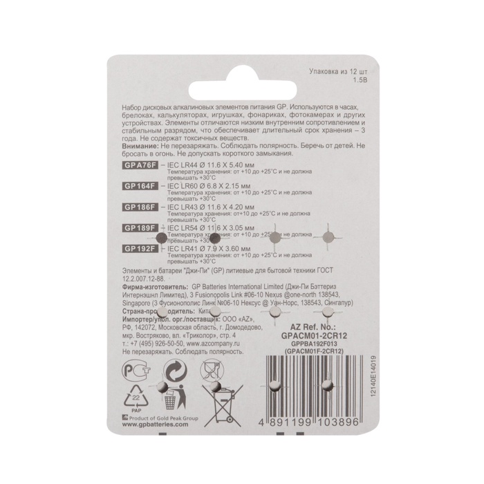 Батарейка алкалиновая GP, ACM01-12BL(А76 по 4 шт.;164,186,189 192-по 2 шт.); 1.5В,12 шт.