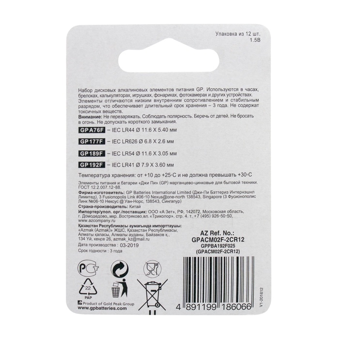 Батарейка алкалиновая GP, ACM02F-12BL(А76 по 4 шт.;164,186,189 192-по 2 шт.); 1.5В,12 шт.