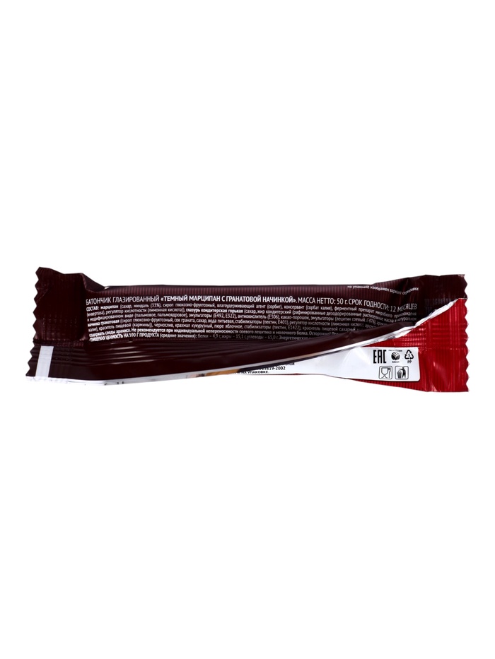 Этот глазированный батончик соединяет плотную сладость темного марципана и яркую кислинку гранатовой начинки. Лаконичная пластиковая упаковка защищает форму и сохраняет свежесть. Его нейтральное оформление подходит для любого момента — как личный десерт к чашке эспрессо или элегантное дополнение к сладкому столу.