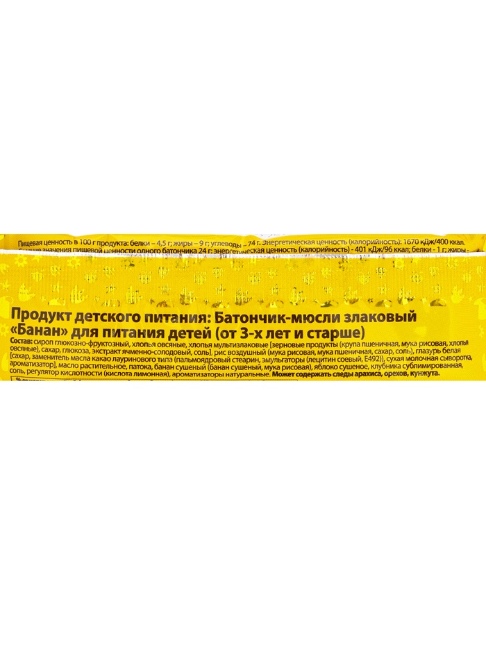 Злаковый батончик со вкусом банана. Вкусный и питательный перекус с большим содержание злаков. В составе овсяные и кукурузные хлопья, рисовые шарики. Продукт детского питания.