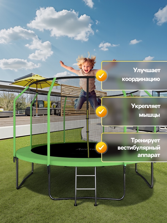 - В комплект входит лестница, которая обеспечивает стабильную опору при входе и выходе с батута.