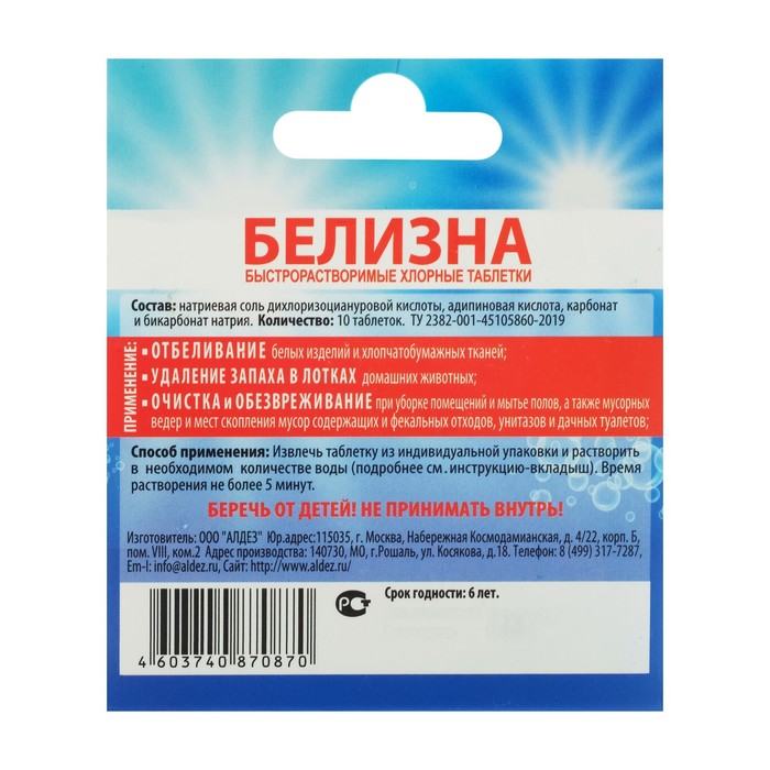 Быстрорастворимые хлорные таблетки для отбеливания белых изделий и хлопчатобумажных тканей; удаление неприятного запаха предметов и поверхностей (сантехническое оборудование, лотки домашних животных, мусорные ведра и т.д.); очистка и обезвреживание при уборке помещений и мытье полов, мест скопления мусора и фекальных отходов, дачных туалетов и прочих загрязнений.