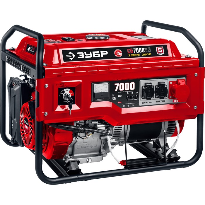 Бензиновый генератор ЗУБР СБ-7000Е-3, 4Т, 7000 Вт, 2х220 В/380 В, ручной/электропуск обеспечит вас электроэнергией вдали от стационарных источников и на период проведения аварийных работ. Благодаря небольшим размерам устройство можно перенести в любое удобное для вас место. Ток вырабатывается посредством преобразования механической энергии двигателя внутреннего сгорания. Запаса топлива и мощности достаточно, чтобы обеспечить бесперебойную подачу электричества в течение нескольких часов.