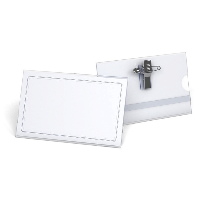 Бейдж из высококачественного прозрачного пластика с металлическим зажимом и булавкой.