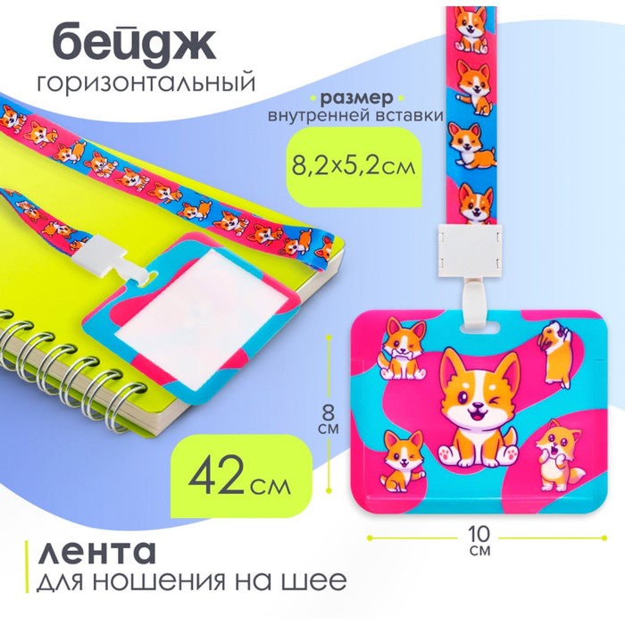 Горизонтальный бейдж с очаровательным принтом корги — стильное и удобное решение для мероприятий, офиса или учёбы. Выполнен из прозрачного пластика, который защищает вставку от повреждений и загрязнений. Внешний размер 100×80 мм, внутренний — 52×82 мм, что позволяет легко вставлять и менять карточки. Лента длиной 42 см комфортно располагается на шее, не натирая кожу. Прочный, долговечный и легкий — он идеален для идентификации на конференциях, выставках и в повседневной работе.