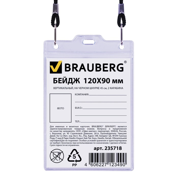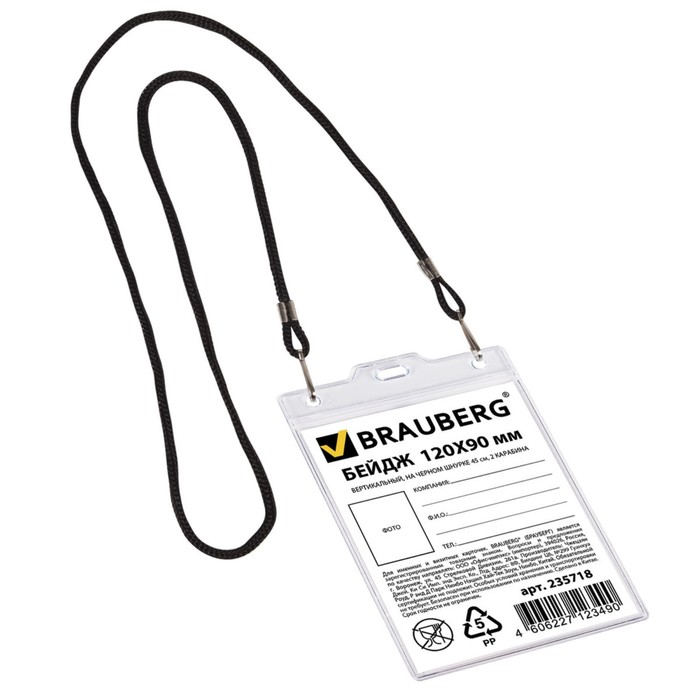 Вертикальный БОЛЬШОЙ бейдж BRAUBERG для именной карточки предназначен для идентификации сотрудников в компаниях, а также на семинарах, тренингах, презентациях и других мероприятиях. Бейдж на текстильном шнурке с двумя карабинами используется для размещения именных карточек, пропусков, пластиковых карт. Карман из мягкого прочного пластика гарантирует долгий срок службы. Закрепляется черным шнурком 45 см с карабинами. Размер вкладыша 90х120 мм.