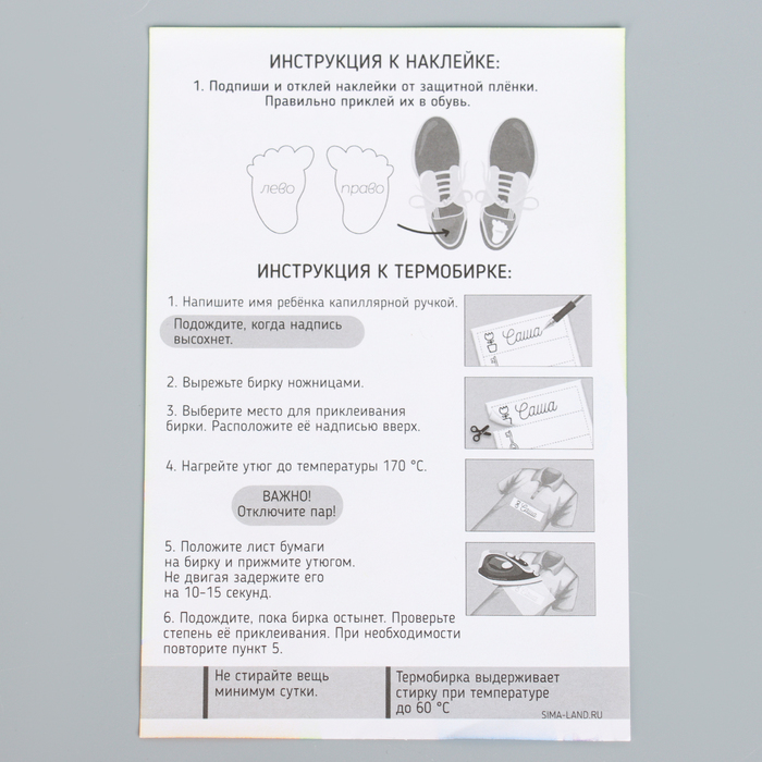 Не стирайте вещь минимум сутки. Термо бирка выдерживает стирку при температуре до 60 °C.
